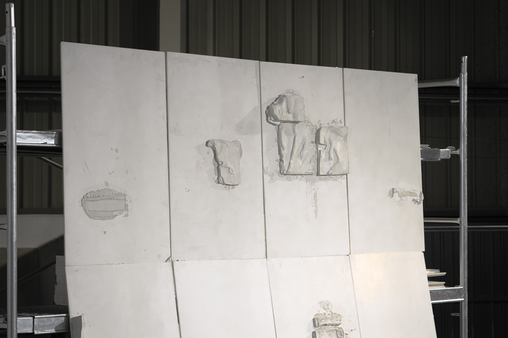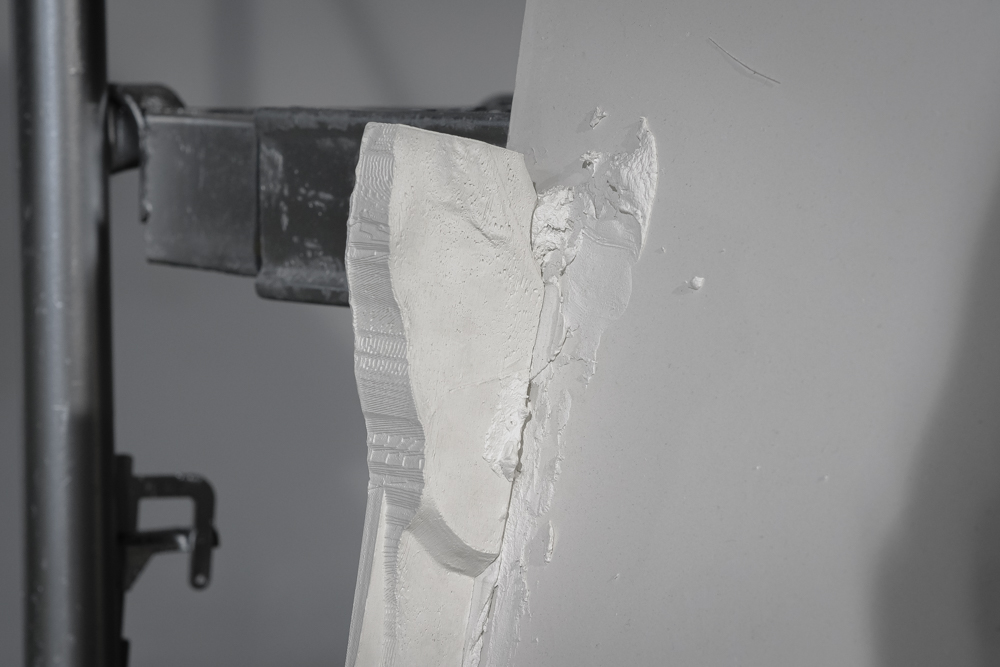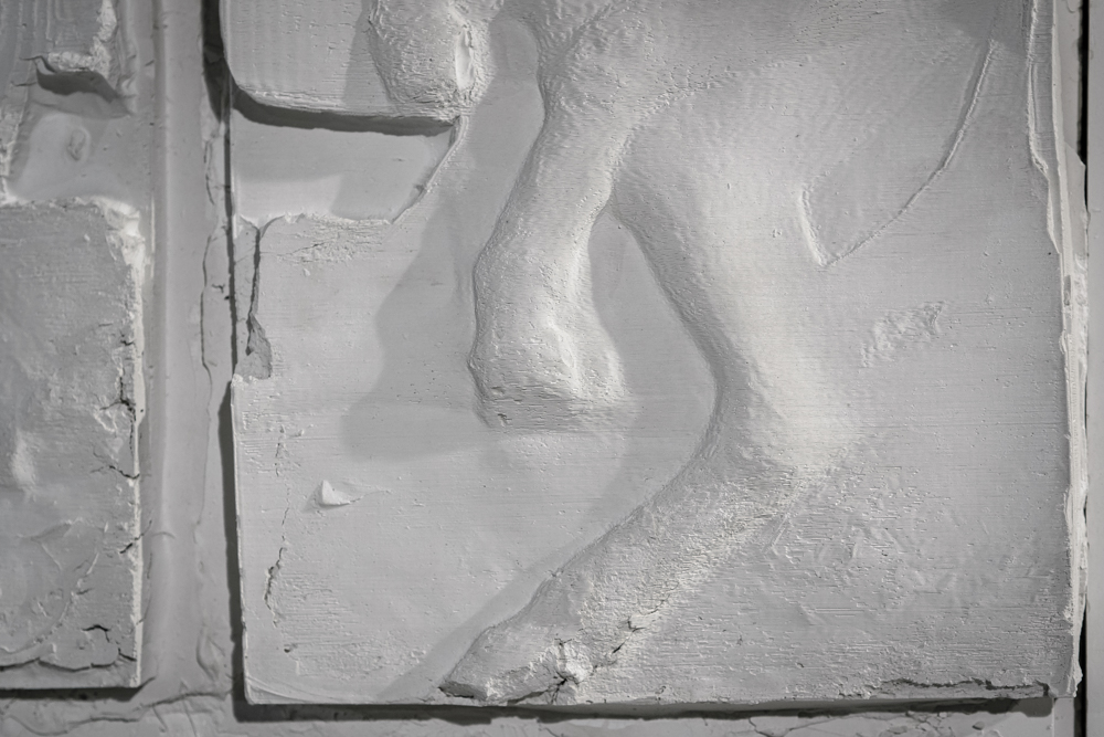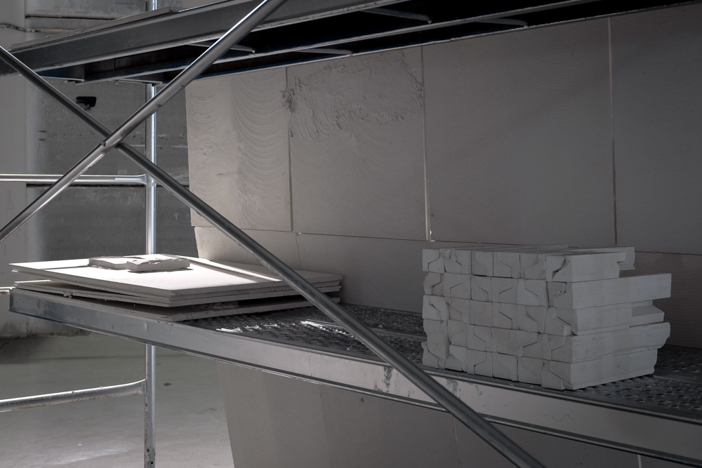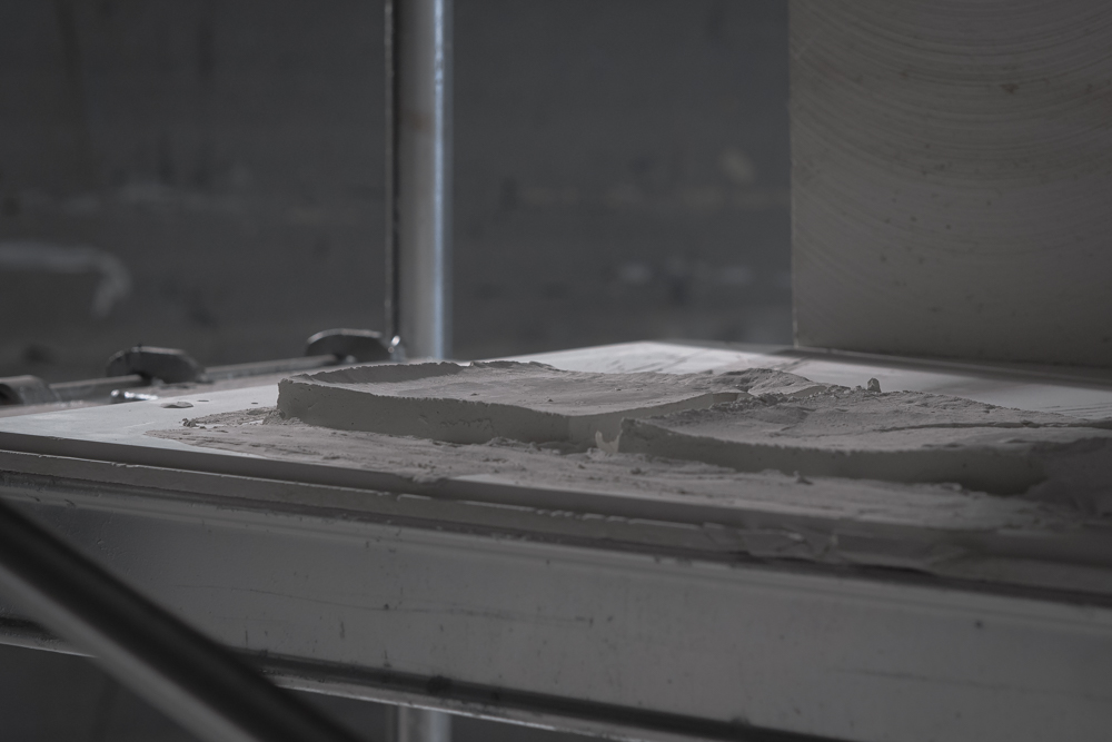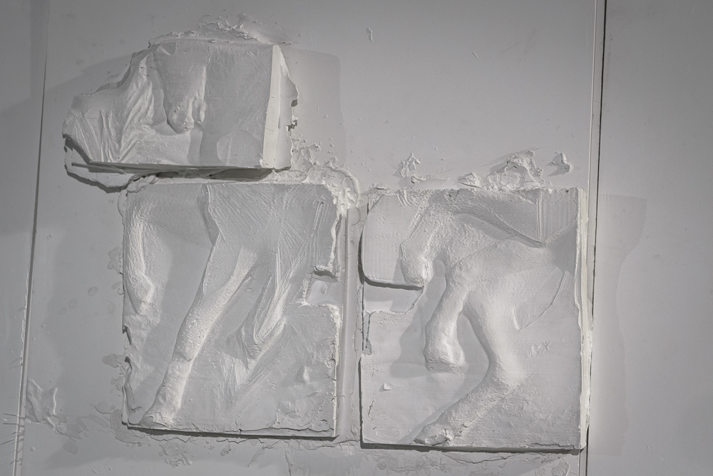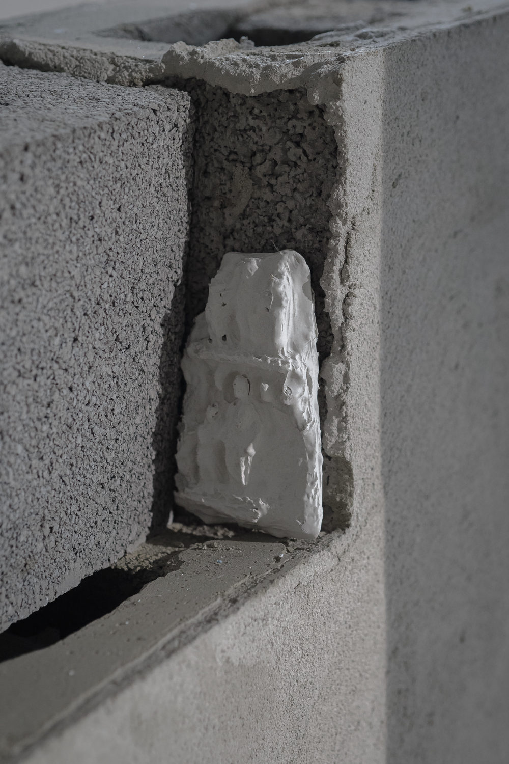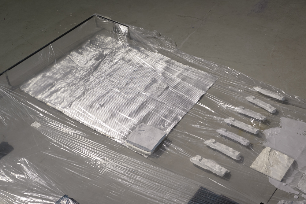 Si se mira con atención, entre la escayola -antes líquida, ahora sólida- que materializa las piezas, puede verse sobresalir pequeños fragmentos de material plástico, una estructura digital, una impresión 3D que deja entrever un proceso temporal más intrincado del que se podía prever inicialmente. Las piezas, no son en realidad fragmentos erosionados del tiempo, sino que esta erosión aparente es fruto de un proceso de impresión 3D en el que se construye una malla, un fantasma digital extraído escaneando tallas de piedra antiguas, que posteriormente se sumerge en escayola, atrapando en su retícula el líquido y haciendo que se solidifique con la forma de la malla.