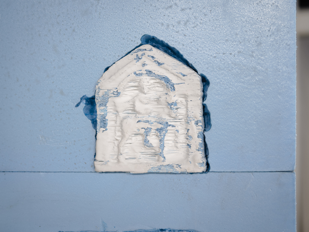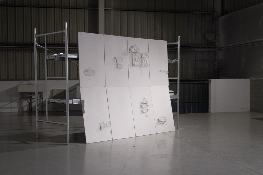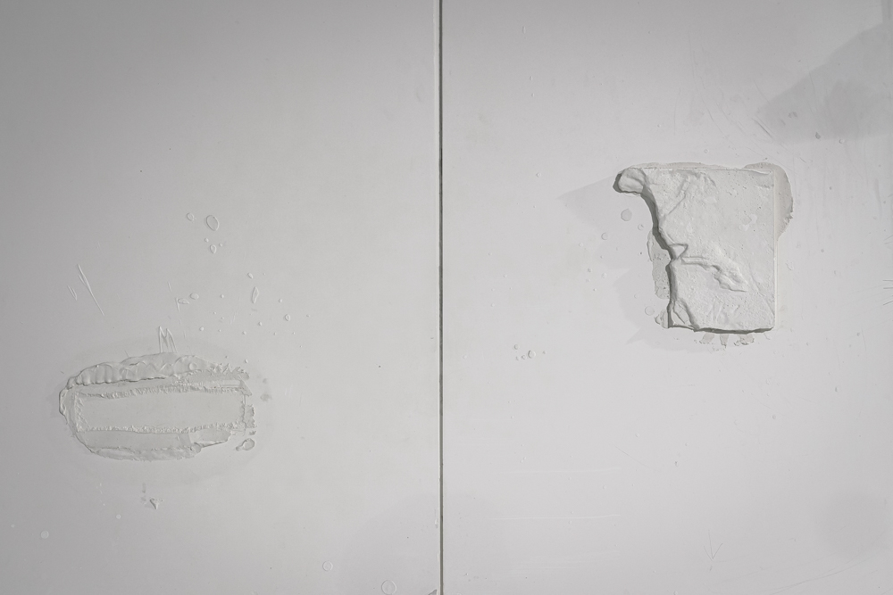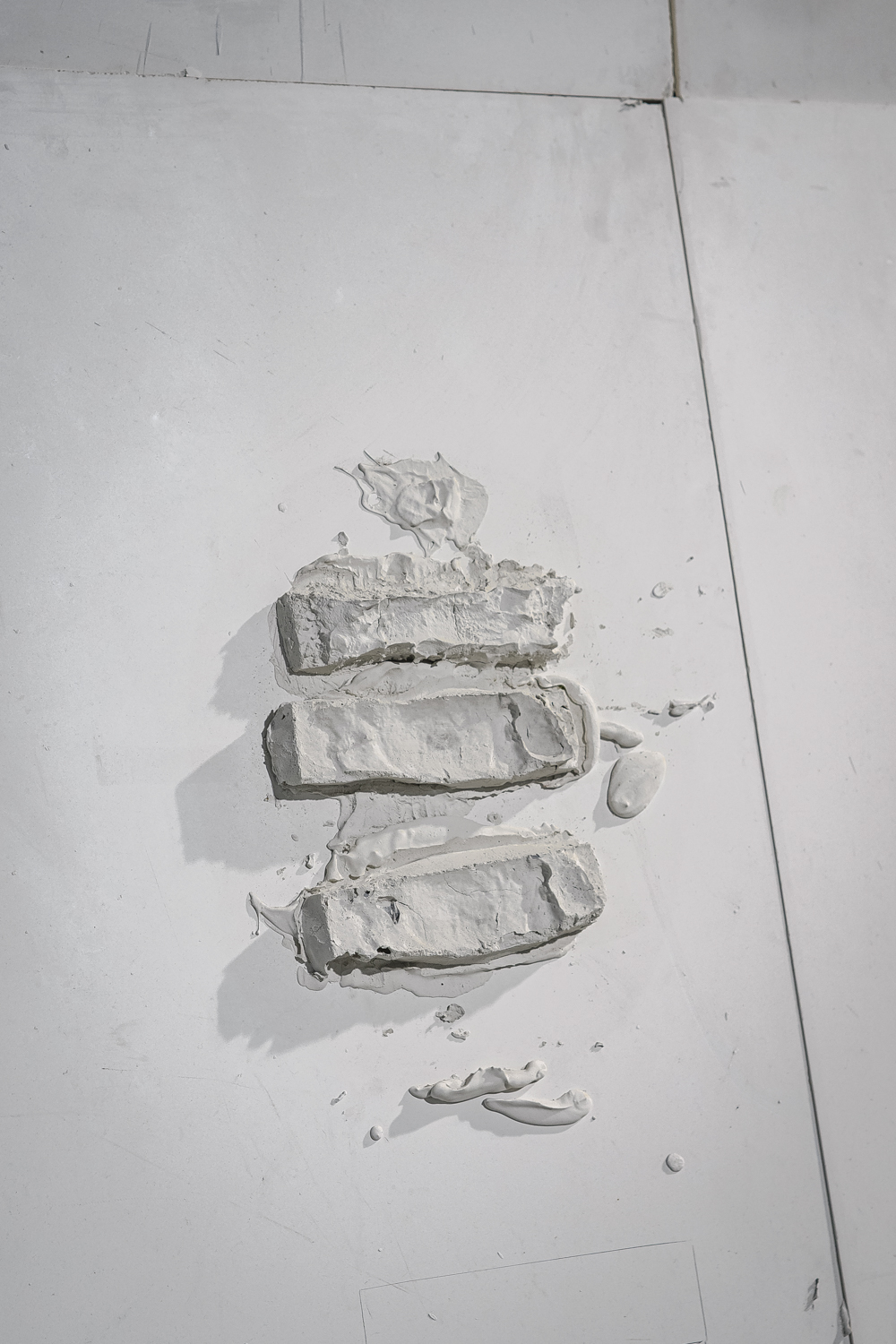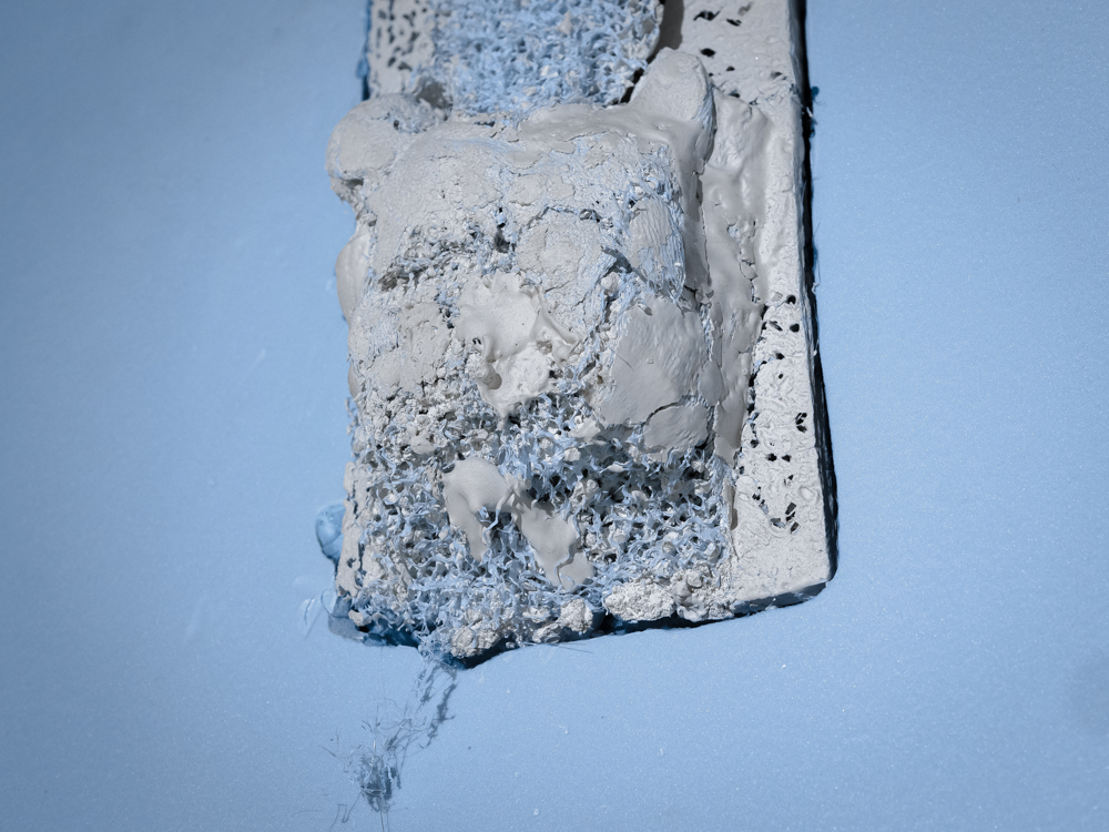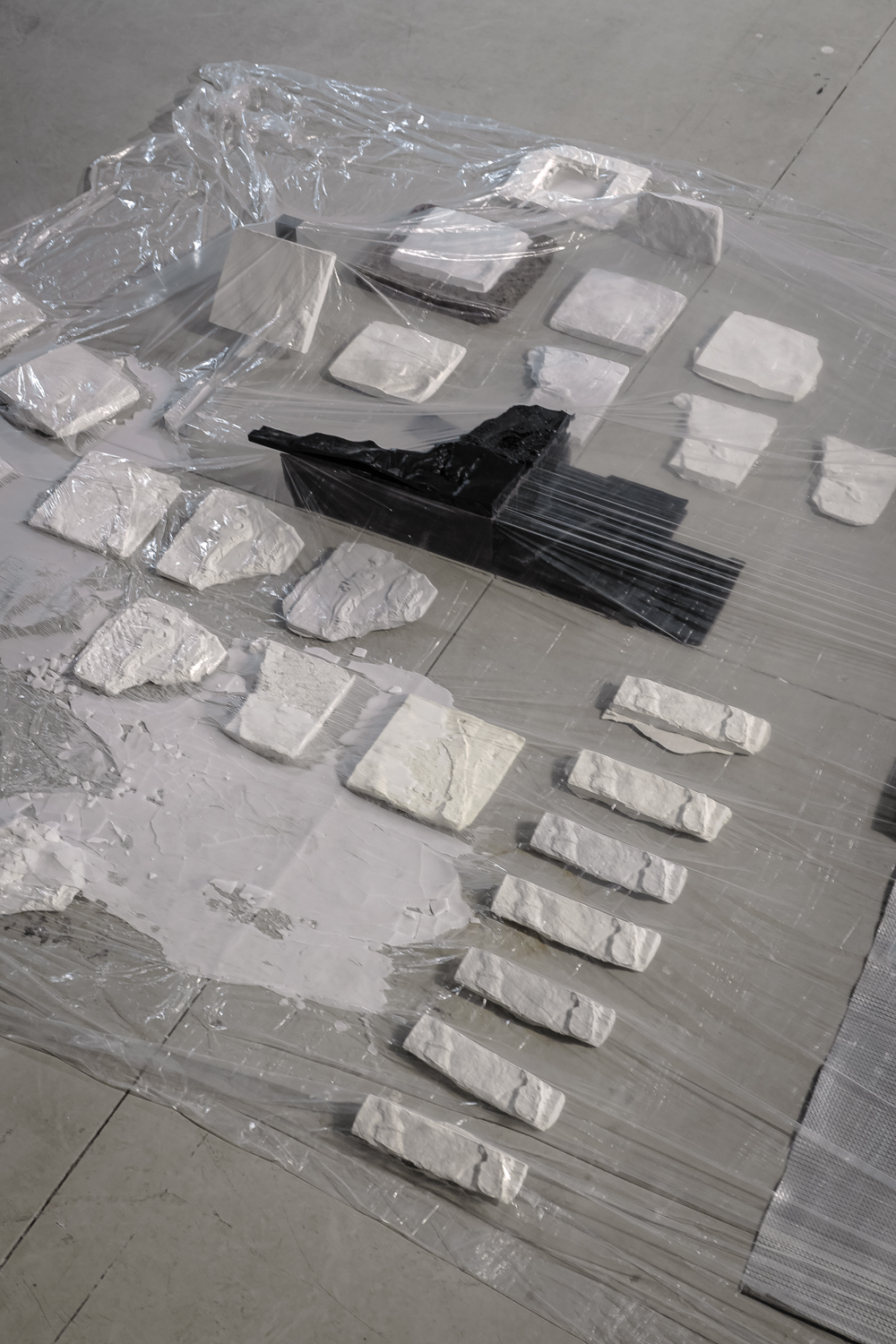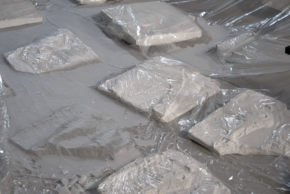 Si se mira con atención, entre la escayola -antes líquida, ahora sólida- que materializa las piezas, puede verse sobresalir pequeños fragmentos de material plástico, una estructura digital, una impresión 3D que deja entrever un proceso temporal más intrincado del que se podía prever inicialmente. Las piezas, no son en realidad fragmentos erosionados del tiempo, sino que esta erosión aparente es fruto de un proceso de impresión 3D en el que se construye una malla, un fantasma digital extraído escaneando tallas de piedra antiguas, que posteriormente se sumerge en escayola, atrapando en su retícula el líquido y haciendo que se solidifique con la forma de la malla.