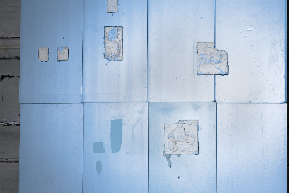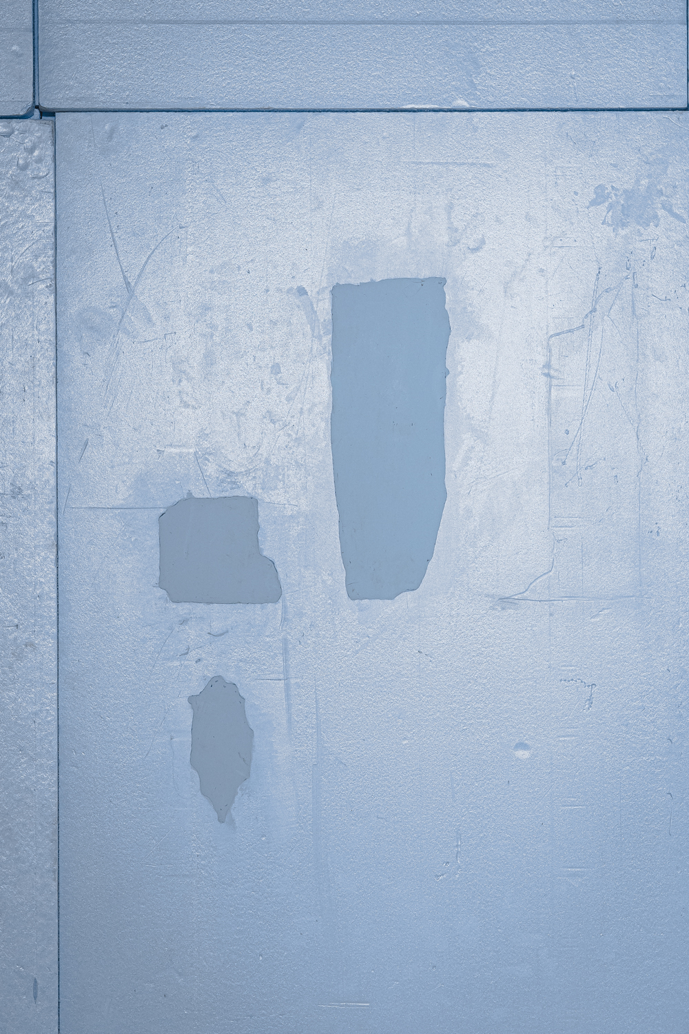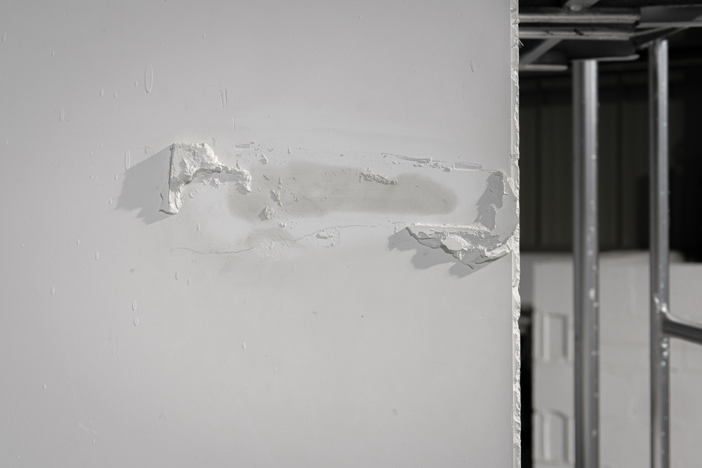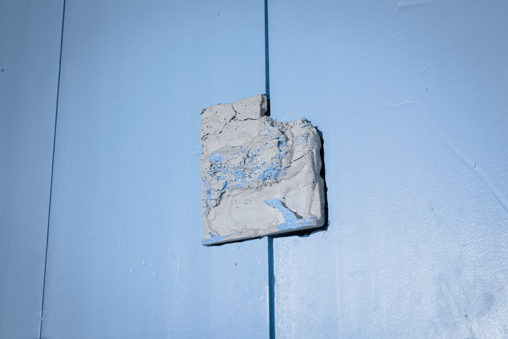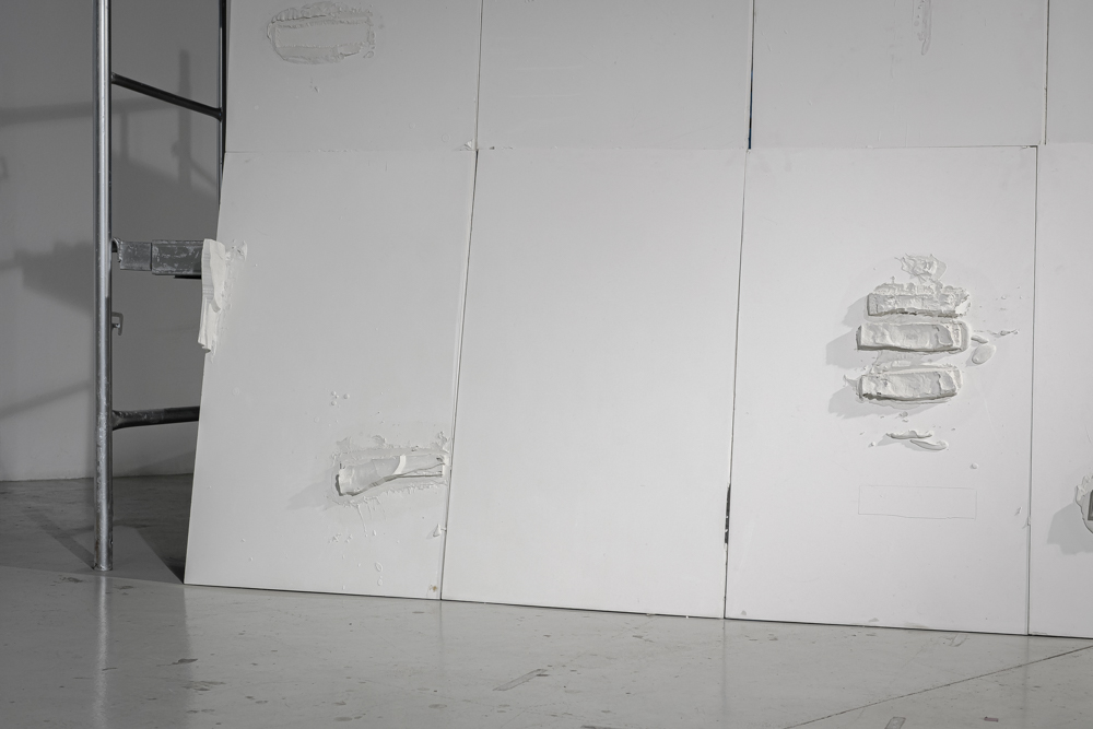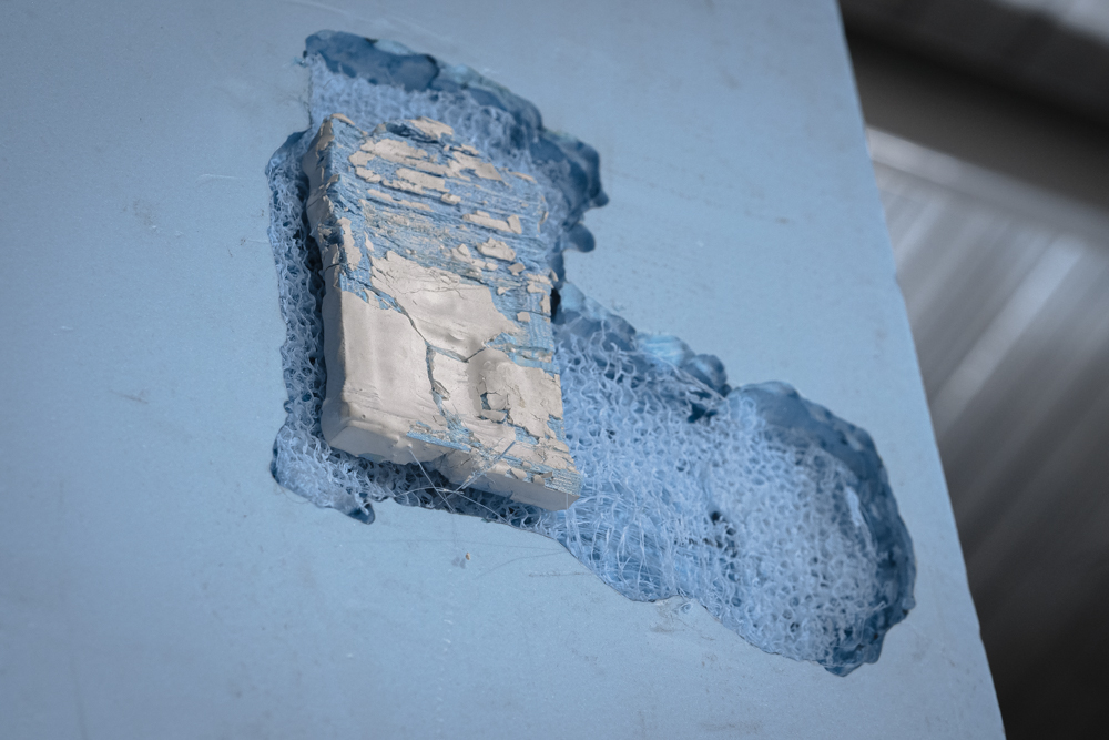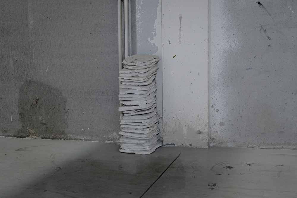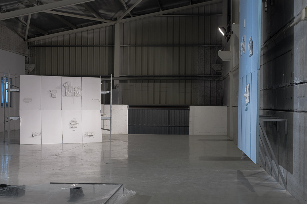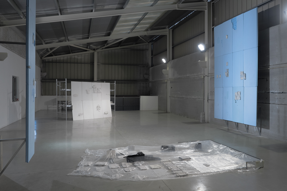 Si se mira con atención, entre la escayola -antes líquida, ahora sólida- que materializa las piezas, puede verse sobresalir pequeños fragmentos de material plástico, una estructura digital, una impresión 3D que deja entrever un proceso temporal más intrincado del que se podía prever inicialmente. Las piezas, no son en realidad fragmentos erosionados del tiempo, sino que esta erosión aparente es fruto de un proceso de impresión 3D en el que se construye una malla, un fantasma digital extraído escaneando tallas de piedra antiguas, que posteriormente se sumerge en escayola, atrapando en su retícula el líquido y haciendo que se solidifique con la forma de la malla.