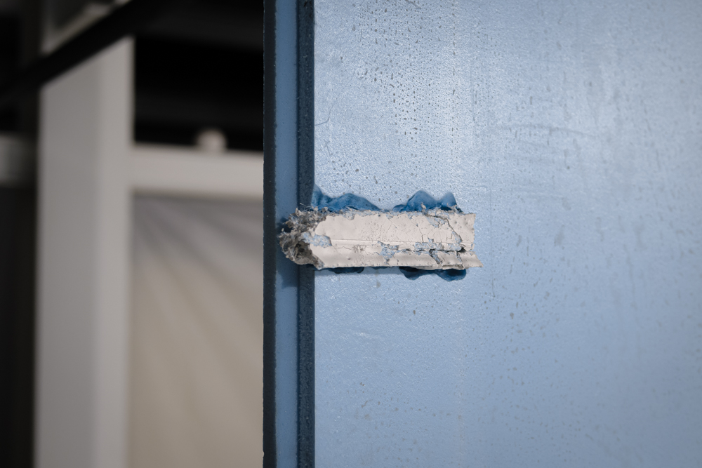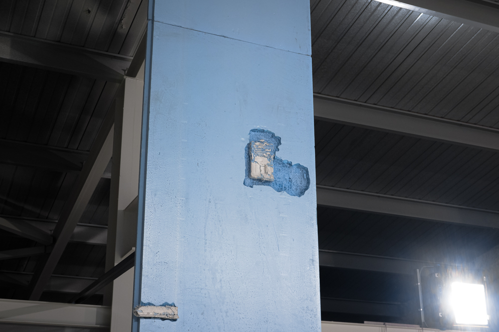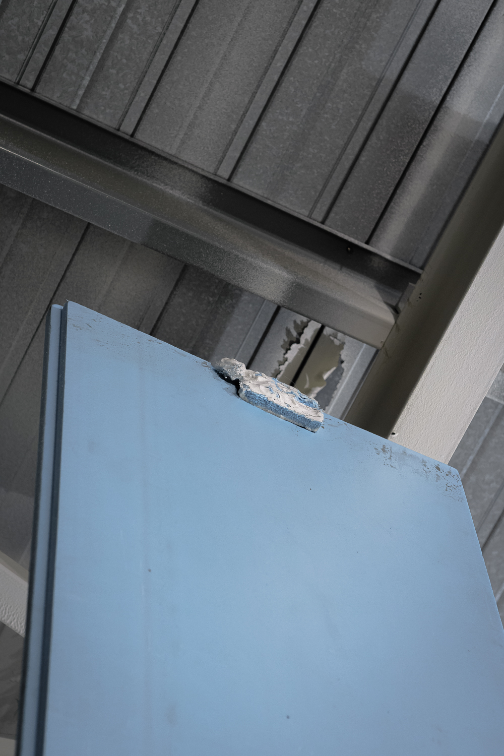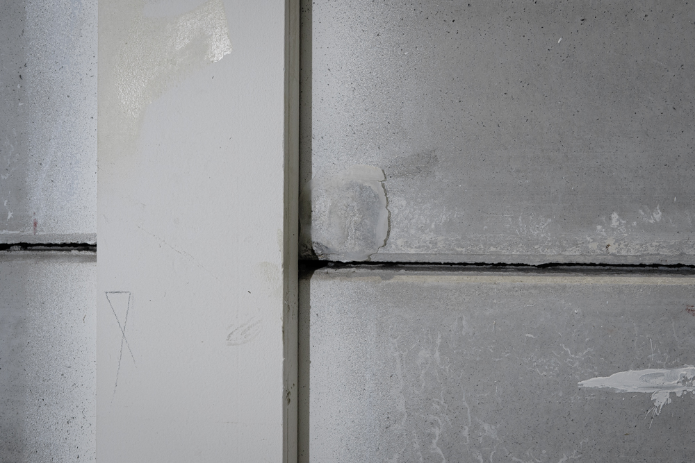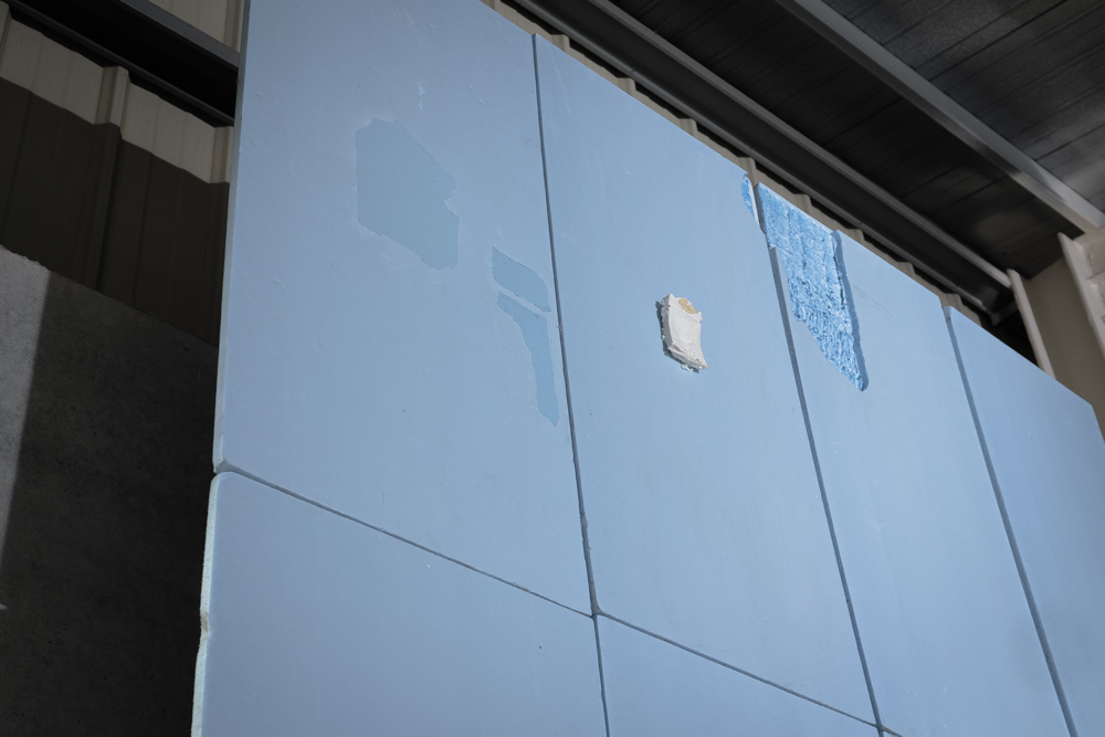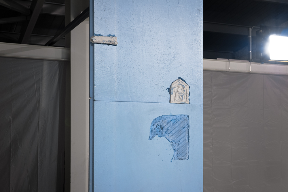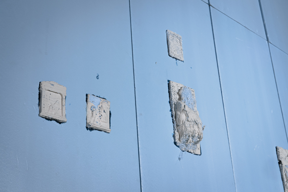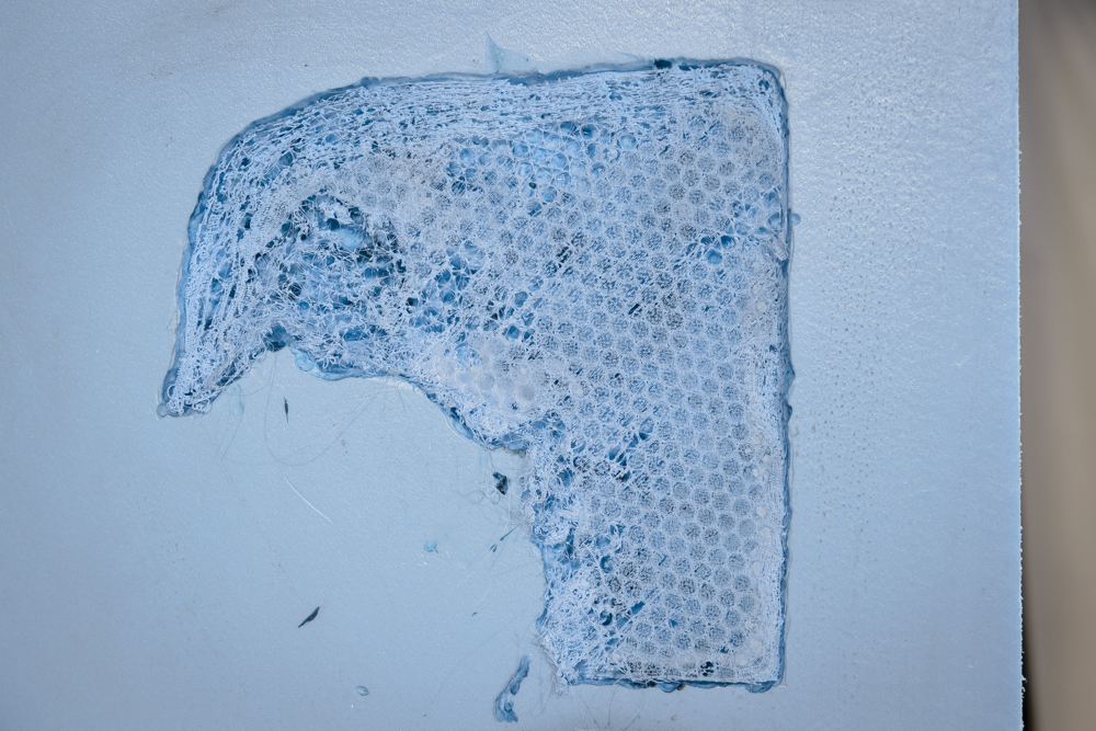 Si se mira con atención, entre la escayola -antes líquida, ahora sólida- que materializa las piezas, puede verse sobresalir pequeños fragmentos de material plástico, una estructura digital, una impresión 3D que deja entrever un proceso temporal más intrincado del que se podía prever inicialmente. Las piezas, no son en realidad fragmentos erosionados del tiempo, sino que esta erosión aparente es fruto de un proceso de impresión 3D en el que se construye una malla, un fantasma digital extraído escaneando tallas de piedra antiguas, que posteriormente se sumerge en escayola, atrapando en su retícula el líquido y haciendo que se solidifique con la forma de la malla.