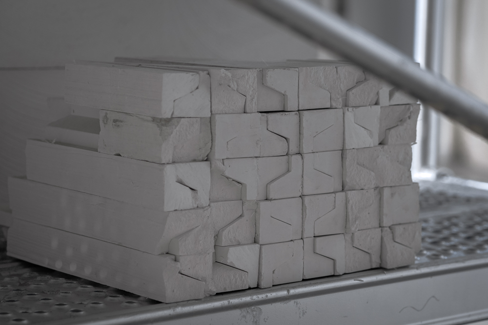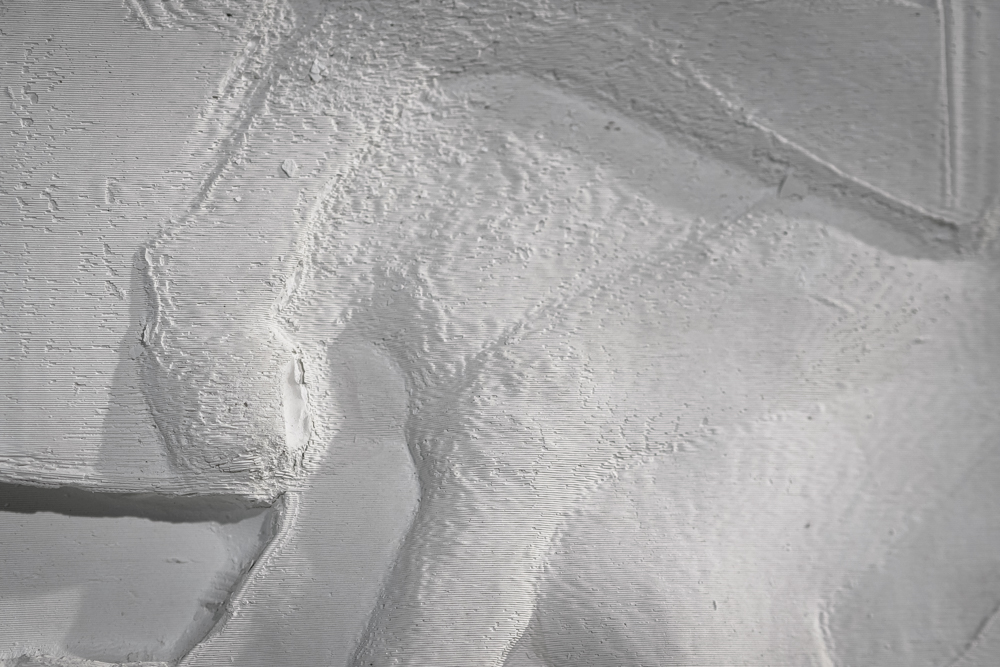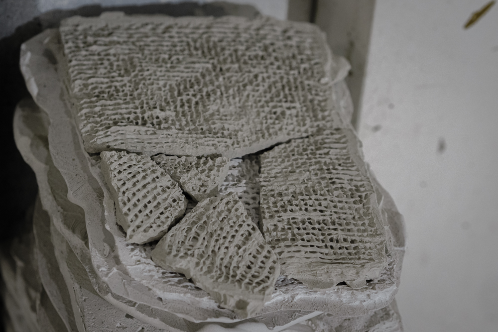 If you look carefully, between the plaster -before liquid, now solid- that materializes the pieces, you can see small fragments of plastic material coming through, a digital structure, a 3D impression that reveals a more intricate temporal process than could be foreseen initially. The pieces are not actually eroded fragments of time, but this apparent erosion is the result of a 3D printing process in which a mesh is built, a digital ghost extracted by scanning ancient stone carvings, which is later submerged in plaster, trapping the liquid in its grid and causing it to solidify in the shape of the mesh.
